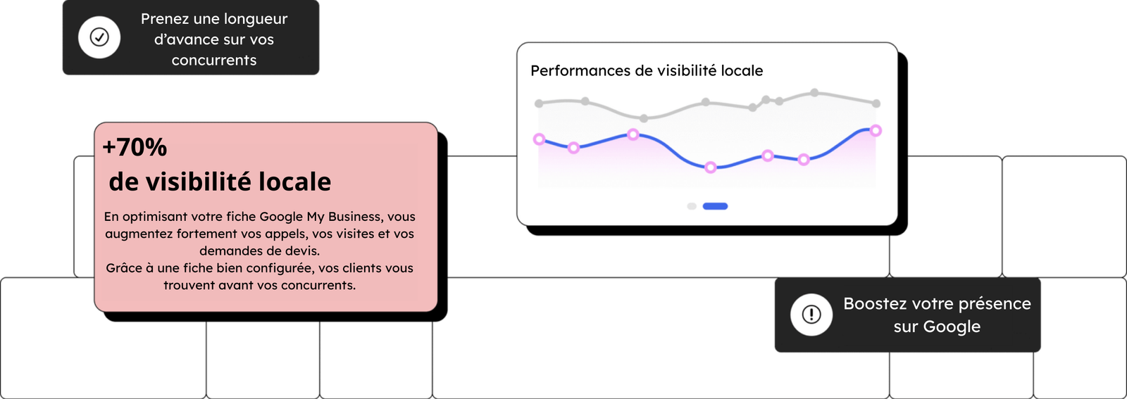 Grâce à des méthodes simples et efficaces, nous vous aidons à générer plus de clients sans effort, en automatisant votre visibilité locale et votre présence sur Google.